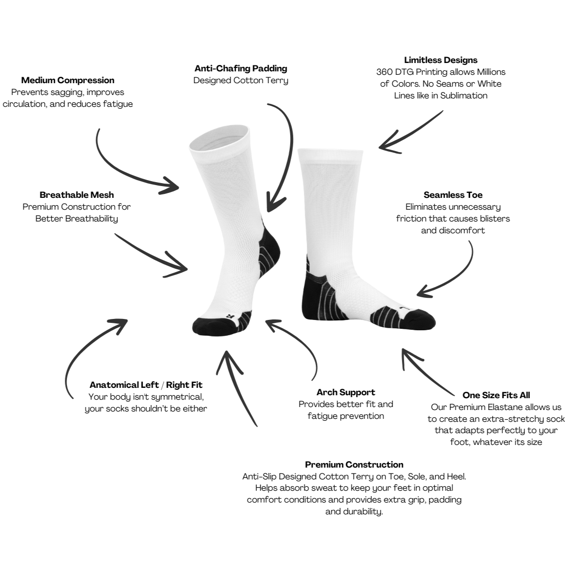 Designed with extra anti-friction terry on the heel area and light compression on the cuff to improve support, stimulate circulation, and reduce leg fatigue.